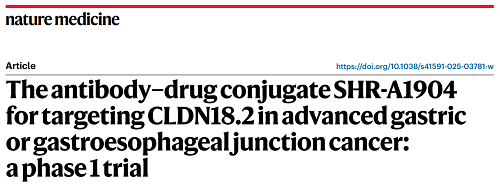 AG真人医药CLDN18.2 ADC创新药SHR-A1904治疗胃癌临床研究结果荣登Nature Medicine